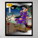 Genießen Sie die lebendige Verschmelzung von Tradition und Fantasie mit diesem faszinierenden Kunstwerk. Das Stück besticht durch einen Charakter, der in einem fein gemusterten Kimono verziert ist und durch Farbenreichtum und detaillierte Blumenmotive verstärkt wird. Eine einzigartige Drehung wird präsentiert, da der Charakter über einen Tierkopf verfügt und der Komposition ein verzauberndes Element hinzugefügt wird. Der Hintergrund zeigt eine ruhige Landschaft, die in Dämmertönen getönt ist und von der ein Vollmond hinter den Wolken schaut und die mystische Aura verstärkt. Die Laterne auf der Seite strahlt ein warmes Licht aus, während die entfernten Berge und die Brücke ein Gefühl der Ruhe und der Verbindung zur Natur hervorrufen. Dieses Kunstwerk verkörpert wunderbar das Wesen der japanischen Kunst mit einer modernen Drehung und ist somit eine perfekte Ergänzung zu jedem Raum, der von Kreativität und Kultur lebt. Dieses Stück verbindet auf meisterliche Weise traditionelle japanische künstlerische Elemente mit spielerischer moderner Interpretation. Die detaillierten Muster, die sorgfältige Komposition und die reichen Farbverläufe zeigen, wie gut die Kunstfertigkeit ist, während die skurrile Attraktivität des Felinenkreises erhalten bleibt. Der Gesamteindruck schafft ein anspruchsvolles Stück, das eine bemerkenswerte Ergänzung zu zeitgenössischen und traditionell gestalteten Räumen wäre.