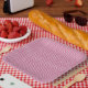 Wiederholtes Muster einer kleinen, gewellten, rötl Pappteller