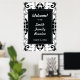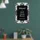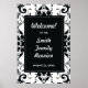 Family Wiedersehen Welcome Sign Sign mit schwarz-weißem Damast Muster Hintergrund. Vollständig anpassbarer Text für Ihre Familienveranstaltung. Poster kann an einer Wand oder Tür aufgehängt werden, oder an Bord montiert werden oder am Eingang Ihres Party an einem Strang ziehen.