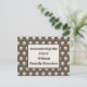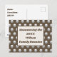 Erzählen Sie Ihre Wiedersehen mit diesen schönen und günstigen Postkarten. Das Muster auf der Vorderseite weist ein elegantes silberfarbenes Polka-Punktmuster auf, das auf dunkelbraunem Hintergrund steht. Das Zentrum verfügt über ein braun umrissenes Rechteck mit blassgrauem Mittelpunkt, das den Hintergrund für Ihre Ankündigung, Familienname und das Jahr liefert. Die Rückseite der Postkarte bietet viel Platz für Ihre Veranstaltungsdetails.