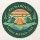 Erstellen Sie einzigartige Untersetzer als Favoriten für Ihr Camping-Thema Familie Wiedersehen-Party. Das Design ist auf einem dunkelgrünen Hintergrund mit Camping-Zelten, Kiefernwäldern und einem Vintagen Sonnenuntergang gestaltet. Der Vorlagentext vereinfacht die Personalisierung.