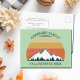 Coole Wiedersehen-Postkarteneinladung für eine Herbstveranstaltung mit Cousins, Tanten, Onkeln und Großeltern. Laden Sie die ganze Crew mit Ihrem Nachnamen und Jahr in Grün ein, um das wunderschöne Sonnenuntergang über Bergen und Bäumen zu umgeben. Großartiges personalisiertes Gruppenreisedesign für Camping.