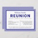 Moderne Blue Stripe Familie Wiedersehen Einladung. Schmale, navy blaue Streifen der Curlicue auf weiß, da es eine moderne Atmosphäre. Ihre Wiedersehen-Daten werden in einem weißen Rechteck mit einem breiten marineblau Rahmen platziert. Ihr Familienname und Ihre Wiedersehen sind in großen marineblau geschrieben. Personalisieren Sie die Wiedersehen-Daten der Familie unten. Das marineblaue Streifen-Muster bedeckt die Rückseite der Einladung