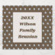 Personalisieren Sie Ihr nächstes Wiedersehen-Dinner mit diesem preiswerten Bierflaschenlabel. Das Polka Dot Muster zeigt silberne Kreise auf dunkelbraunem Hintergrund. Ein großes Rechteck in der Mitte ist braun und beige und bietet einen soliden Hintergrund für Ihre personalisierten Wiedersehen-Informationen. Schnell und einfach das Jahr und Ihren Familiennamen anpassen. Diese Bierflaschen-Etiketten bieten auch eine einfache und einzigartige Möglichkeit, für Ihre Wiedersehen-Gäste Keepsakes zu kreieren.