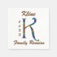 Diese Papierservietten sind die ideale Möglichkeit, um Ihre nächste Wiedersehen zu personalisieren. Der Buchstabe K weist ein buntes, gefliestes Design in Erdtönen auf. Der Nachname und das Jahr Ihrer Familie erscheinen zusammen mit dem Familienmonogramm, das vor und in der Mitte steht. Schnell und einfach personalisieren Sie alle Texte, um eine Serviette zu erstellen, die Ihnen hilft, einen Schnappschuss für Ihre nächste Ansammlung zu machen.