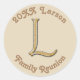 Wenn Sie eine Wiedersehen planen, bietet dieser Aufkleber eine kostengünstige Möglichkeit, Ihre Veranstaltung zu personalisieren. Das wunderschöne Gold- und Silberbrief L Monogramm ist zentriert und von Ihren personalisierten Wiedersehen-Informationen umgeben. Fügen Sie schnell und einfach das Jahr und den Namen Ihrer Familie hinzu. Die Hintergrundfarbe kann auch individuell angepasst werden, wenn Sie es wünschen.