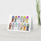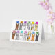 Zwei Reihen niedlicher Cartoon-Katzen stehend sich auf ihren hinteren Pfoten und halten pastellfarbene Karten. Auf den Karten sind Briefe geschrieben, die 'Family Wiedersehen' ausdrücken. Das Bild hat einen weißen Hintergrund.