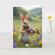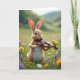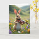 Dieses Design zeigt einen flauschigen, aufrecht stehenden Hasen mit rehbraunem Fell, der auf einer grünen Wiese steht und ein kleines Saiteninstrument hält, als ob er gerade eine sanfte Melodie spielen wollte 🐰. Ein kleiner gelber Vogel sitzt nahe auf der gekrümmten Oberseite des Instruments und neigt sich mit einer aufmerksamen Haltung vor, was ein süßes, vertrauensvolles Band zwischen den beiden vermittelt. Sanftes Licht fällt auf ihre Gesichter, fängt die weiten, neugierigen Augen des Hasen ein und gibt der Szene eine zarte, kameradschaftliche Stimmung. Um sie herum sind verstreute Wildblumen in Lavendel, Sonnengelb und Weiß wie kleine Zeichen der Zuneigung über das Gras verteilt 🌷. Der Hintergrund verschwimmt in grüne Hügel und einen hellen Himmel mit einem unscharfen, traumhaften Aussehen, das den Fokus auf das Paar richtet. Oben in der Mitte befindet sich der Grußtext in einem hellen Pastellton, darunter ist eine kleinere Textzeile in einem etwas dunkler