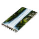 Mit meinen Fotografien habe ich dieses digitale Bild eines Wasserfalls geschaffen, der in einem Berg versteckt ist. Der Wasserfall mündet in eine Steinmauer, die mit Moos und Farnen bedeckt ist. Das Wasser fällt sanft in den Felsenpool unten ab. Im Vordergrund ist ein gefallener Baum und einige Felsbrocken. Cairns wurden von Besuchern geschaffen. Image Copyright ©2024 Kimberly J Tilley. zazzle.com/store/developingnature