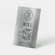 Modernes, aus gebürstetem Silber gefertigtes Imitat mit Metalltafelschild, das Ihren Kunden, Kunden und Gästen eine einfache Verbindung zu Ihrem WiFi-Netzwerk ermöglicht. Geben Sie eine Website-Adresse ein, um einen skalierbaren QR-Code zu erstellen, laden Sie Ihr Logo hoch und fügen Sie weitere Details hinzu, wie den Netzwerknamen und das Kennwort.