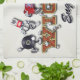 Die Sehenswürdigkeiten und die Ikonen von Wigan, in größerem Manchester, in England, stylised Cartooncharakters seiner Exporte und townscape, einschließlich (von links nach rechts) NordSoulaufzeichnung, Transport für größeres Manchester-Zeichen für Wigan (TfGM) Wallgate Bahnhof (mit Wigan Athletic Schal), eines Onkel Joes Mint Ball, der Orwell Pub kennzeichnend Versionen eines an Wigan Pier hörend Wigans Piermusik und schließlich an einem Stagecoachbus Nr. 32 mit Wigan Kriegerschal und an berühmter Wigan Torte. Wigan wird heraus im traditionellen roten Ziegelstein und im Sandstein, mit BaumwollBlumenverschönerung buchstabiert.