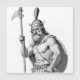 Schwarzweißbild eines muskulösen Wikingerkriegers oder Nordkriegers. Er trägt einen Hörnerhelm mit einer Feder oder einem Bauch und einen Umhang. Der Charakter hält einen Speer oder eine Hallebarde in seiner linken Hand und weist eine beeindruckende Physik mit einem sportlichen und muskulösen Körper auf. Sein Gesicht ist von einem harten Ausdruck gekennzeichnet, mit intensivem Blick und einem Bart mit Husten. Der Stil der Illustration ist sehr detailliert und ähnelt einer Skulptur oder einem technischen Design mit großer Sorge um Realismus und anatomische Details.
