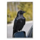 Ein ziemlich zahmer Raven, der auf einem Autospiegel sitzt und nach Essgewohnheiten warte. Fotografiert im Yellowstone Nationalpark. Fügen Sie Ihren eigenen Text für einen perfekten Anlass hinzu.