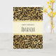 Glückliche Geburtstagskarte mit einem stilvollen Muster mit exotischen Leoparden in schwarz auf goldenem Hintergrund. Ein cremefarbener Rechteckrahmen mit einem Imitat Goldfolie, der oben mit dem personalisierten Text überlagert ist.