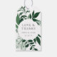 Bringen Sie diese eleganten botanischen Tags an Ihre Gastgeschenke Hochzeiten, um sich bei den Gästen in schicken Stil zu bedanken. Weiße Anhänger haben einen runden Rahmen von Winterfolien in frischen Jägergrün-Tönen, die Rahmen "Liebe und Dank" und Ihre Namen und Hochzeiten Datum in klassischer Schrift. Der gesamte Text kann für eine ultimative Anpassung bearbeitet werden. Entworfen, um unsere Hochzeitskollektion im Wilden Wald zu ergänzen.