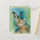 Diese charmante Tierkunst-Postkarte zeigt die Artenkunst, die einen braunen Hasen im Profil abbildet, während sie in groben Zügen tanzt. Die Kreatur hat lange, schwarz getauchte Ohren und ein perkantes, gelbes Auge.