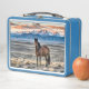 Ein wildes Pferd aus der Bucht beobachtet den Betrachter, mit Schneespitzen und Sagebrush im Hintergrund. Ein wunderschönes Bild von Western Americana, perfekt für Mädchen oder Frauen, die Pferde Liebe.