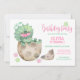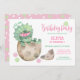 Invite your guests to have a "dino-mite" time at your little girl's first birthday party with this Wild One dinosaur invitation that features a cute Triceratops with pink flower headband and pink and mint green dino footprints. Perfect for Jurassic and prehistoric themes. Original artwork KL Stock