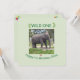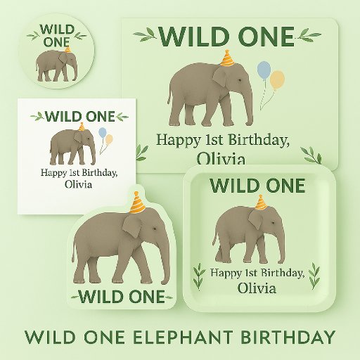 A cheerful Wild One birthday invitation featuring a gentle elephant wearing a party hat on a soft light‑green background. Leafy accents frame the “Wild One” heading on the front, with balloons highlighting the “Happy 1st Birthday, Olivia” message below. The back includes space for all your party details in a clean, easy‑to‑read layout. The name shown is only an example — you can use the personalization tool to update the birthday child’s name and event information.