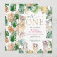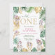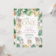 Niedliches Gold und grüner Dschungel & Safari Thema "Wild One" 1. Geburtstag Einladung mit wilden Tier- und tropischen Blätter Design mit Gold und grünem Blattmuster auf der Rückseite.