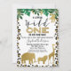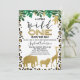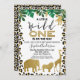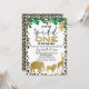 Süße Imitate Goldsafari-Tiere und Leopardenhautmuster Babydusche Einladung. Das Design umfasst vier Imitat Goldfolie-Safari-Tiere, etwas Blattwerk und ein Leopardenmuster. Auf diese niedliche Art und Weise können die Gäste zu einer wilden, thematischen Babydusche einladen.