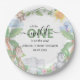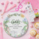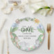 Babyduschpapier-Teller mit Aquarellbildern für Affen, Papagei, Nashörner und Giraffen, die in einem grünen Dschungelhintergrund sitzen. Die Stile, die Größe und die Farbe des Schriftartes können durch Klicken auf den Link nach der Personalisierung anpassen geändert werden.