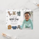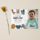 Niedliche und lustige Kindergeburtstagsfeier, in der Safaritiere wie Giraffen, Schneeleopard, Nashorn, Löwen, Elefanten und Zeebra gezeigt werden. Im Text steht "Wild One". Ideal für ein Party zum 1. Geburtstag eines Jungen. Fügen Sie auch das Foto Ihres Kindes auf der Kartenvorderseite hinzu.