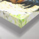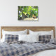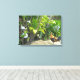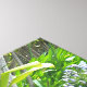 Er ist ein einzigartiger Hahn mit so vielen bunten Federn und steht neben wunderschönen Grünpflanzen und blühenden Sträuchern.