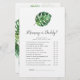 Dieses Wild-Pokal "Mama oder Papa" ist perfekt für eine Babydusche zum Thema Strand. Das Design besticht durch eine exotische Auswahl an grünen Bananenpalmen, Farnen, Blattwerk, botanischen Pflanze und Grünpflanzen, die für einen tropischen Sommer sorgen. Personalisieren Sie die Rückseite der Karte mit dem Namen der Mutter-zu-sein-und das Duschdatum. Sie können die Fragen des Spiels personalisieren, indem Sie auf den Button "Anpassen" klicken.