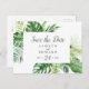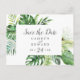 Diese wilde tropische Palme Save the Date Postkarte ist ideal für einen Strand oder eine Hochzeit in Urlaubsort. Das Design besticht durch eine exotische Auswahl an grünen Bananenpalmen, Farnen, Blattwerk, botanischen Pflanze und Grünpflanzen, die für einen tropischen Sommer sorgen.