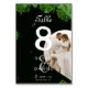 Set die Szene für eine magische Feier mit unserer Wild Tropical & Lush Palm Blätter Foto Hochzeit Tischnummer! Dieses einzigartige Design befördert Ihre Gäste zu einem tropischen Paradies, das eine atemberaubende Anordnung von wilden Palmen-Blätter mit glitzernden Wasserfällen aufweist. Finden Sie Ihren Platz stilvoll! Eine prominente Tischnummer steht im Zentrum der Bühne in einem kühlen und modernen Schriftart und führt Ihre Gäste zu ihrem designten Tisch. Personalisieren Sie es mit den Namen der Braut und des Bräutigams, indem Sie eine besondere Touch hinzufügen. Ein zartes Knotensymbol verbindet elegant ihre Namen und symbolisiert die schöne Gewerkschaft, die sie teilen. Einen bleibenden Eindruck hinterlassen! Persönlich gestalten Sie Ihre Tischnummern weiter, indem Sie ein wertvolles Foto von Ihnen und Ihrem Partner hinzufügen und so ein einzigartiges und unvergessliches Erlebnis für Ihre Gäste schaffen. Vervollständigen Sie das Design mit Ihrem Hochzeitstag und Ort, und fügen Sie eine Touch von sentimentalen Details. Zazzles Designtools machen die Anpassung zu einem Kinderspiel! Wählen Sie aus verschiedenen Farben, um Hochzeitsfeiern zu erstellen, die perfekt zu Ihrem tropischen Hochzeitsthema passen. Hochzeitsfeier, tropisches Hochzeitsthema, zeitgemäße Hochzeitsdekoration, zazzle Hochzeitsdekor, individuell einstellbare Hochzeitsdetails, elegantes Hochzeitsthema, modernes Hochzeitsdesign, Personalisiertes Hochzeitsgeschirr, Foto-Hochzeitsempfang, Tropische Tischnummer-Karten