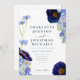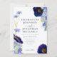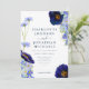 Schöne rustikale bohhobalische Hand bemalt Aquarell Sommerfarben Wildblumen in Marineblau, Maisblume blau, lila, grün und gelb Farbe Hochzeitseinladung mit Online uAwg wedding Website und QR-Code auf der Rückseite. Blume inklusive Kosmos, Maisblumen, Mohn und vergessen Sie mich nicht mit Blattwerk. Einfach zu bedienende Vorlage mit modernen eleganten Typografie-Skripten. Ideal für eine einmalige botanische Seefahrt blauen Themen Sommer oder Frühling Hochzeit. Einzigartiges Originalwerk von Catherine Sweetman