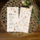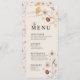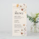 Die Hochzeitsmenükarten zeichnen sich durch den Boho-Stil, die Blumenkunst und die Beige-Farbgebung aus, wobei verschiedene Schriftart-Stile, oft in verschiedenen Größen, kombiniert werden, um einen einzigartigen, eklektischen Look zu schaffen, der die natürliche Ästhetik dieses Menüs ausmacht.