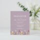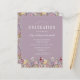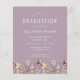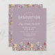 Ein wunderschöner, floraler Rahmen von Wildblumen in Aquarelltönen schmückt den unteren Rand dieser trendigen Boho Abschlussfeier. Passen Sie den weißen Text auf einem lila Hintergrund an, mit dem Namen des Absolventen in der Handschrift, dem Schuljahr und dem Unterrichtsjahr in Serifen und Datum, Ort und UAWG in Serif-Schriftart. Die Rückseite der Karte weist ein Muster von Wildblumen auf einem lila Hintergrund auf.