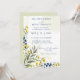 Diese Hochzeitsinklusive bietet ein elegantes und blumengeschmücktes Design mit gelben und blauen Blumen im Aquarellstil sowie grünen Blätter, die die Seiten zieren. Der Hintergrund ist mit einer sanften, leichten Wasserfarbenwäsche versehen, die die zarte und künstlerische Ästhetik verstärkt. Das Layout ist gut organisiert, die wichtigsten Details sind deutlich hervorgehoben.