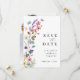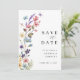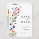 Eine moderne und elegante Hochzeit Save the Date im Frühjahr Sommer Wildblume Thema. Mit farbenfrohen Aquarellpfirsichen, rot-rosa, Lavendel, gelben und staubigen blauen Blüten und botanisch mit Schmetterling und Libelle. Es hat ein Monogramm und eine bearbeitbare Hochzeitswebsite und ein Foto auf der Rückseite. Sie können Text löschen, wenn es nicht nötig ist.
