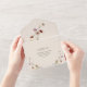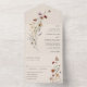 Wildblume All-in-One Hochzeit Einladung. Diese stilvolle und elegante Hochzeitseinladung und die RSVP-Karte verfügen über wunderschöne handbemalte Aquarellfarben in Terrakotta, Bronze-Orange, lila, Rosa und Blau. Finden Sie passende Artikel in der Tan Boho Wildblume Wedding Collection.