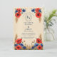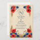 Ein romantischer Blumenrahmen mit roten Mohnblumen und blauen Kornblumen umgibt Ihre individuellen Hochzeitsdetails auf einem weichen Pergament-Stil. Dieses zeitlose Design, das sich perfekt für Hochzeiten im Sommer, auf dem Lande oder auf rustikal inspirierten Hochzeiten eignet, verbindet lebendige Blumen mit Vintagem Charme. Personalisieren Sie sich mit Ihren Namen, Monografie und Datum für einen einzigartigen Sake, der die Schönheit Ihres Festes erahnen lässt.