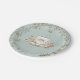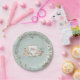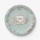 Die Teller sind mit einer Tasse Tee in der Mitte, umgeben von einem zarten Kranz von Wildblumen, ausgestattet. Der Hintergrund ist hellrobinblau. Die Rose ist rot, Salbei grün, blassblau, orange, rosa und weiß.
