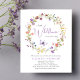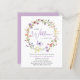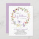 Eine preisgünstige und elegante Babydusche mit "einer kleinen Wildblume ist auf dem Weg", die in einer Mischung aus moderner, weicher grauer Typografie und einem stilvollen Lavendel-lila Drehbuch geschrieben ist, und skurrilen, boho-inspirierten Wasserfarben eines Krans aus lila, rosa, pfirsichfarbenen und gelben Wildblumen und einem lila Schmetterling. Personalisieren Sie den Namen der Mutter und Duschdetails in einfachen Lavendel und graue Typografie.