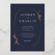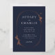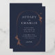 Ein elegantes Hochzeitsdesign mit weißer Typografie auf marinebarbenem Hintergrund, umgeben von einem zarten ovalen Kranz in der Wildblume. Der Kranz ist aus einer Vielzahl von Wildblumen in Rose Goldfolie gefertigt und schafft so ein sanftes und romantisches Aussehen. Die Typografie ist elegant und raffiniert, mit einem klassischen Serif-Schriftart, der den Charme der Einladung noch verstärkt.