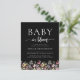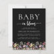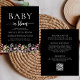 Ein wunderschöner, floraler Rahmen von Wildblumen in Aquarelltönen schmückt den unteren Rand dieser angesagten Babydusche. Die Wörter "Baby in Blüte" erscheinen in Serif- und Script-Schriftart, mit Swashes vor und nach dem Skript. Personalisieren Sie den Text mit dem Namen der Mama-to-be und die Duschdetails in weiß auf einem schwarzen Hintergrund. Auf der Rückseite finden Sie Platz für eine Windelverlosung, Bücher für das Baby und Registrierungsdetails (oder drei Kategorien Ihrer Wahl) sowie einen komfortablen QR-Code, den Sie scannen können, um die Registrierung zu besuchen.