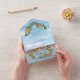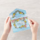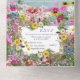 Ein Traumgarten ist umgeben von Kosmos und Wildblumen an einem sonnigen Sommertag mit flauschigen Wolken im blauen Himmel, um eine Ankündigungskarte zu personalisieren.