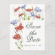 Save the Date Postkarte mit einer Kaskade von Aquarellwiesen-Wildblumen wie roten Mohnblüten und Gras.