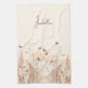 Eine Schürze im boho-Stil. Beige, cremefarbene Unterlage. Die Wildblumen und Bienen sind mit rosafarbenen Wasserfarben dekoriert. Personalisieren Sie Ihren Namen und fügen Sie ihn hinzu.