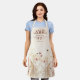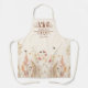 Eine Schürze im boho-Stil. Beige, cremefarbene Unterlage. Die Wildblumen und Bienen sind mit rosafarbenen Wasserfarben dekoriert. Personalisieren Sie Ihren Namen und einen Text und fügen Sie ihn hinzu. Küchenutensilien, die den Namen bestimmen.