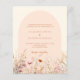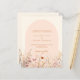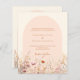 Eine elegante Einladung zur Hochzeit. Cremefarbener Hintergrund und pfirsichfarbener Bogen. Die Wildblumen sind in Beige, Rosa und Aquarell gehalten. Zurück: Fügen Sie die URL/den Link zu Ihrer Hochzeitswebsite für weitere Details und/oder UAWG. 1 Blatt = 1 Einladung gedruckte Kante an Kante.