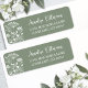 Rücksendeetikett mit Wildblumen-Design. Dieses minimalistische und elegante Etikett ist perfekt für Brautduschen, Babypartys oder jeden, der einen einfachen, zeitlosen Stil liebt. Das Design zeigt einen salbeigrünen Hintergrund mit einer zarten weißen Umriss-Illustration einer Wildblume auf der linken Seite für eine weiche, natürliche Note.