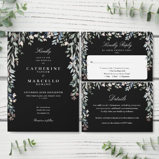 Eine Kaskade von wunderschönen Blumengrün-Wildblumen umrahmen Ihr besonderes RSVP-Set in eleganter schwarzer Typografie. Entwickelt von Thisisnotme©