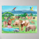 Wilde Tiere Afrikas auf dem Hintergrund der Savanne Landschaft Aquarell Tapete Illustration Hand zeichnend. Safari-Tiere Elefant, Hippo, Büffel, Rhino, Giraffe, Zebra, Flamingo, Baboon, Rose